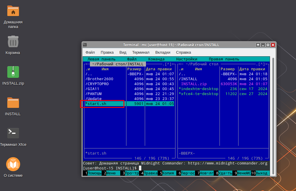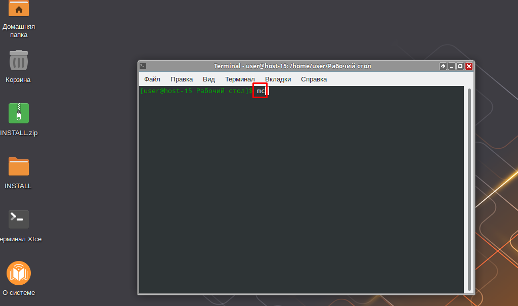 2. Запустите терминал и введите команду «mc» (Midnight Commander)